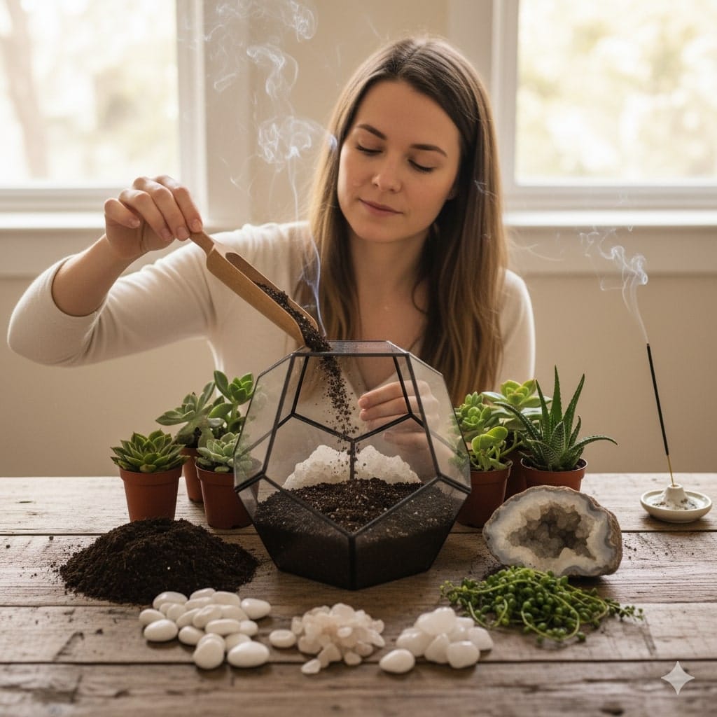Limpieza: Los cristales de tu terrario (especialmente la amatista y el cuarzo) están absorbiendo la energía de la habitación. Cada mes, puedes "limpiarlos" simbólicamente. No necesitas sacarlos. Simplemente puedes soplar humo de salvia o palo santo sobre el terrario.